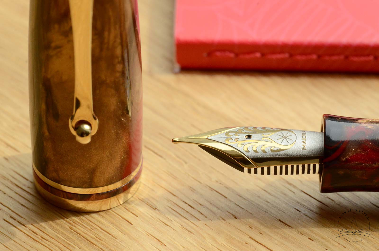 La marque napolitaine a doté son modèle d’une plume en acier inoxydable plaqué or, magnifiquement gravée, et vous la propose en tailles : EF, F, M, B, Stub 1.1, Stub 1.5 ainsi que dans sa version flexible en tailles EF et F.