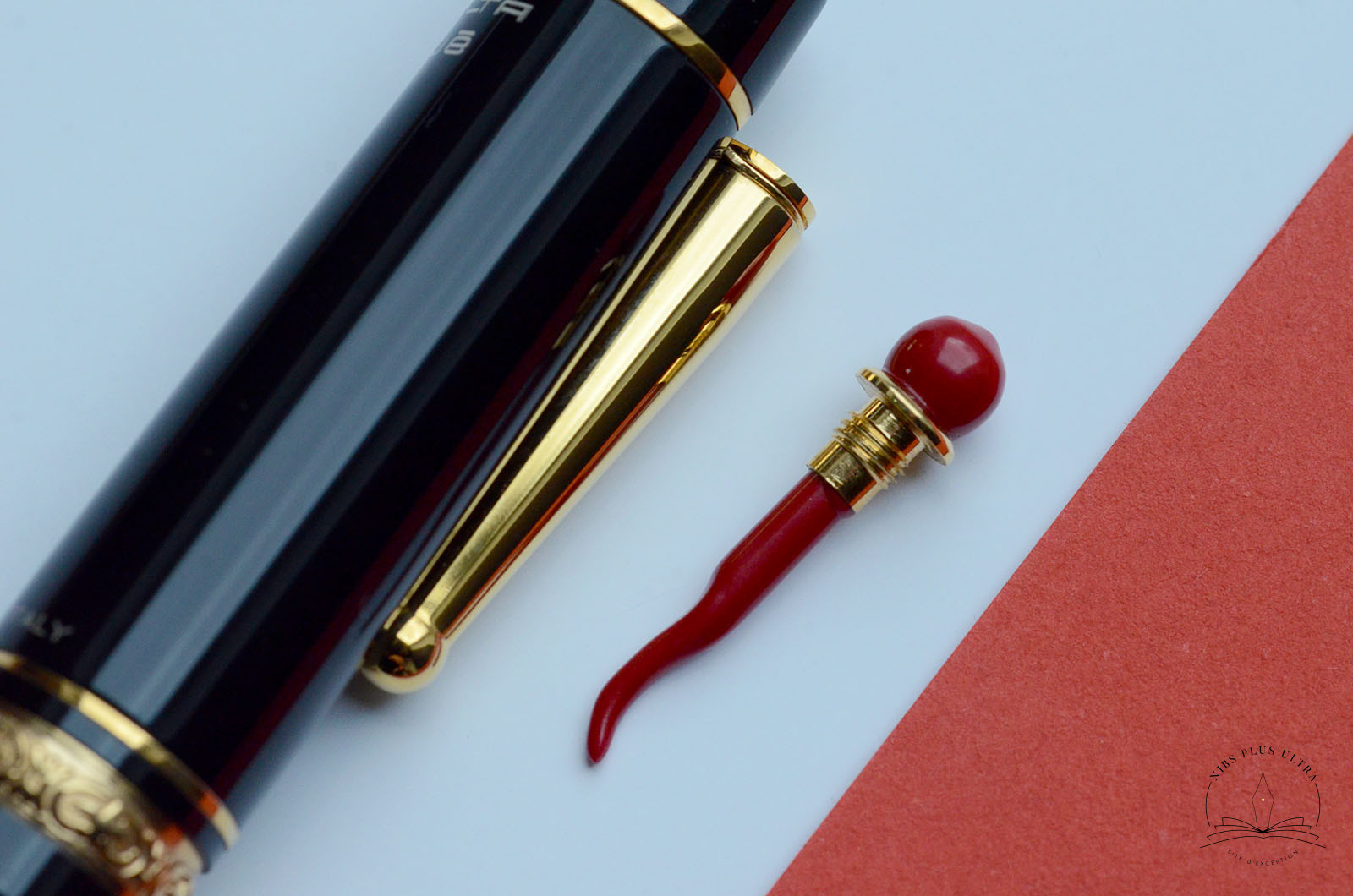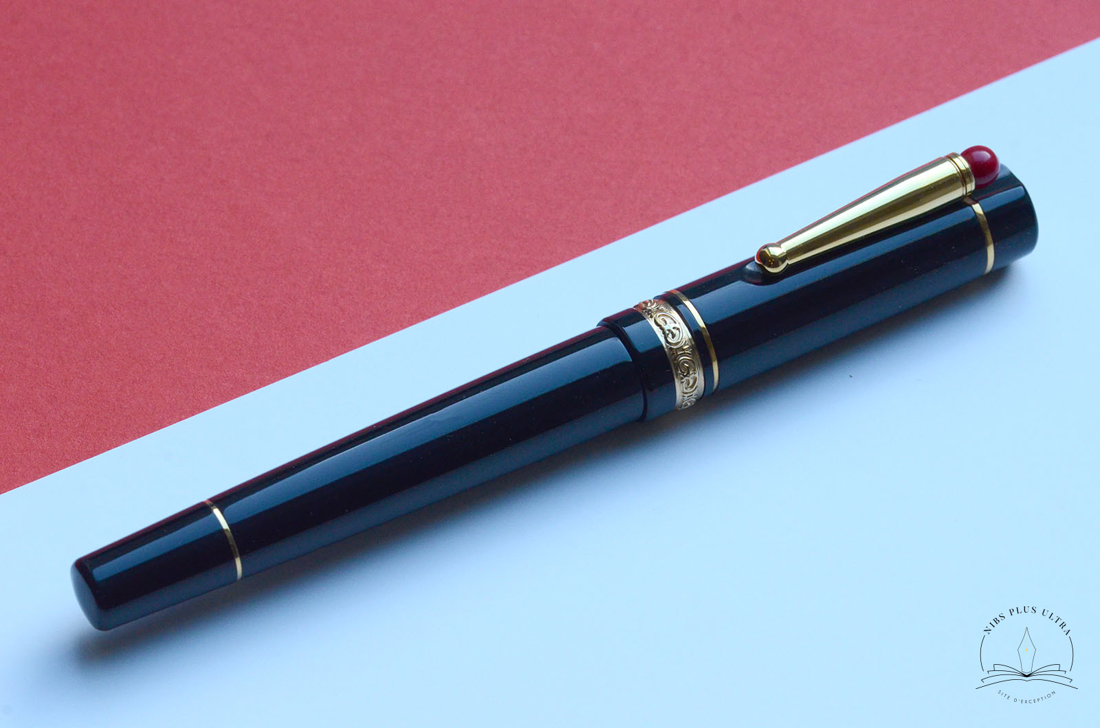 La marque fabrique son modèle entièrement à la main à partir de barres solides de résine de couleur noire. Ses attributs sont en laiton plaqué or : de fines bagues, une agrafe à roulette. Quant au superbe anneau central en-bas du capuchon, il est en argent massif 925 millièmes plaqué or (vermeil). Le dessin qui présente une gravure en haut-relief inspirée du design antique de Pompéi est obtenu par fonte à la cire perdue, une ancienne technique d’orfèvrerie, le tout étant fini à la main et poli. Le filetage interne du corps est en métal. Le haut du capuchon est orné d’un superbe cabochon en métal gravé du logo de la marque